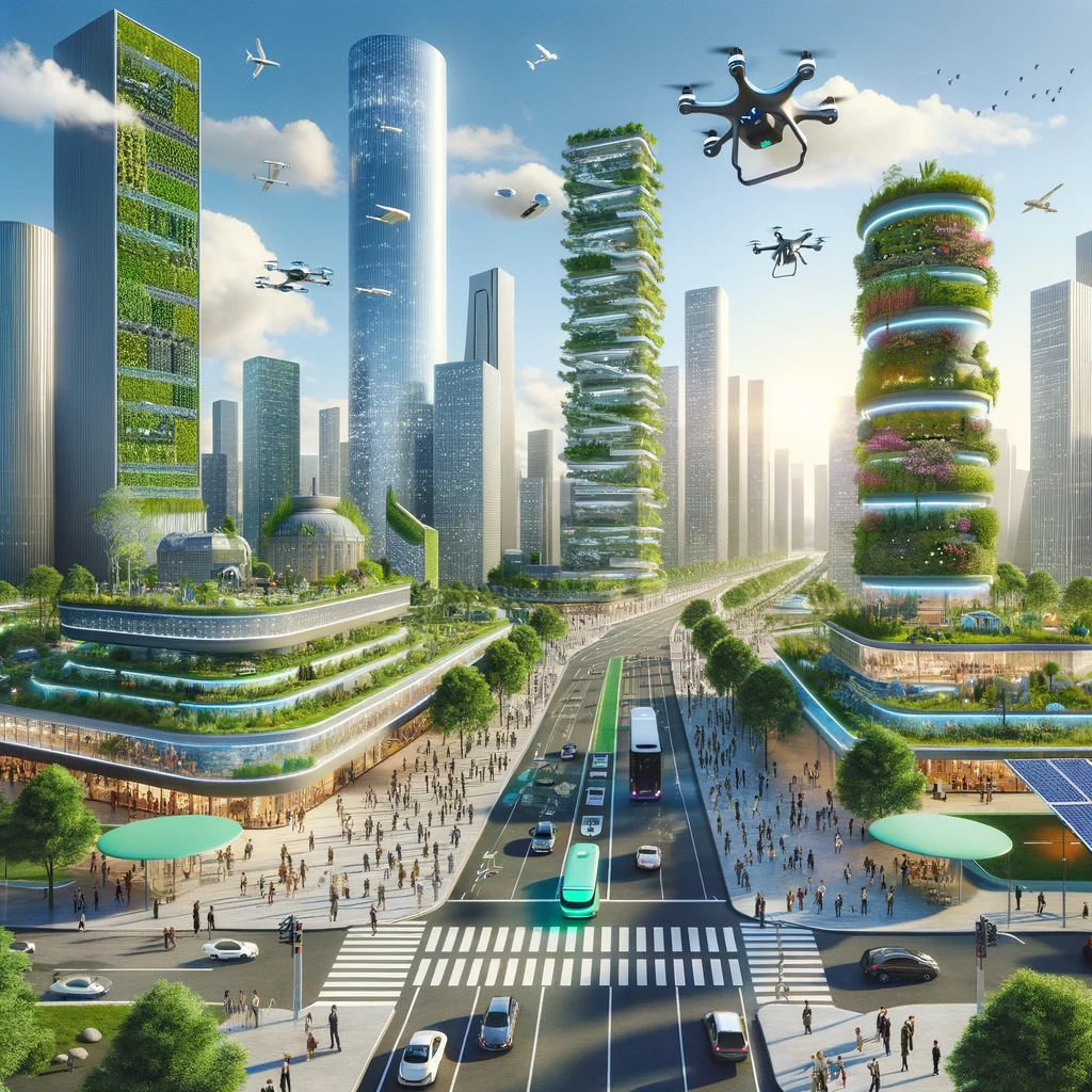 La imagen representa una visión del futuro donde la tecnología avanzada y las soluciones de energía verde se integran armoniosamente en el tejido urbano. Ilustra un entorno urbano sostenible y tecnológicamente avanzado, destacando la colaboración y participación en la investigación y la innovación como claves para abordar los desafíos complejos del siglo XXI.